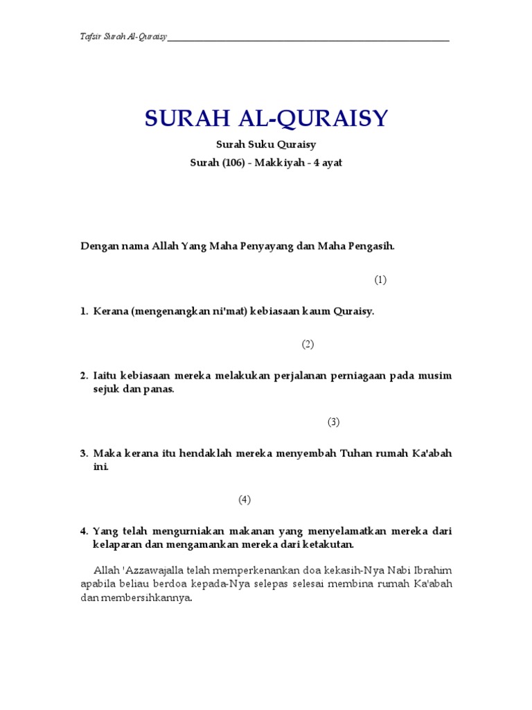 Dewan Muslimat Pas Melaka Fakta Surah Al Quraisy 1 Surat Quraisy سورة قريش Adalah Surat Ke 106 Dalam Al Quran 2 Surat Ini Terdiri Atas 4 Ayat Dan Tergolong Surah Makkiyah 3 Kata Quraisy Sendiri